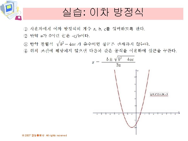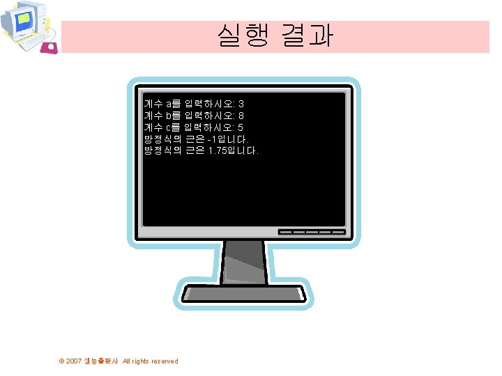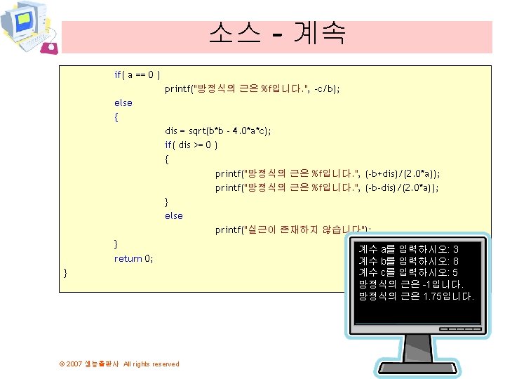 소스 #include <stdio. h> #include <math. h> int main(void) { double a, b, c, dis; printf("계수 a를 입력하시오: "); scanf("%lf", &a); printf("계수 b를 입력하시오: "); scanf("%lf", &b); printf("계수 c를 입력하시오: "); scanf("%lf", &c); © 2007 생능출판사 All rights reserved