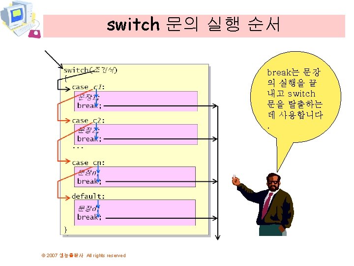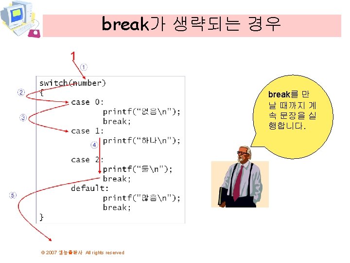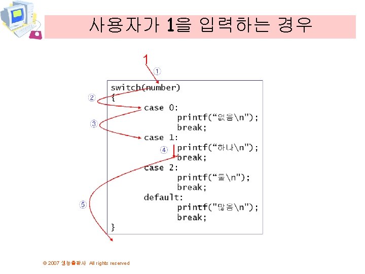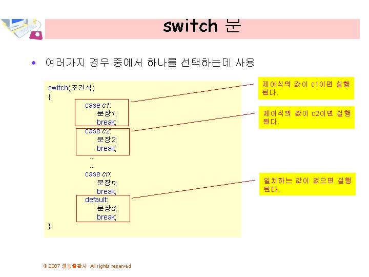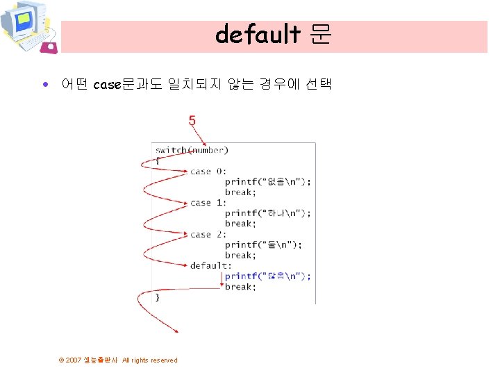 의도적인 break생략 switch(number) { case 0: printf("없음n"); break; case 1: printf("하나n"); break; case 2: case 3: printf("두서너개n"); break; default: printf("많음n"); break; } © 2007 생능출판사 All rights reserved 2개의 경우를 하나로 묶어서 처리하기 위하 여 이러한 기법 을 사용