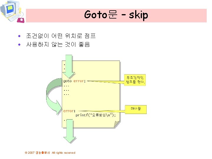 예제 - skip // 구구단출력프로그램 #include <stdio. h> int main(void) { int i = 1; loop: end: } I == 10까지 반복 printf("%d * %d = %d n", 3, i, 3 * i); i++; if( i == 10 ) goto end; goto loop; return 0; © 2007 생능출판사 All rights reserved 3*1=3 3*2=6 3*3=9 3 * 4 = 12 3 * 5 = 15 3 * 6 = 18 3 * 7 = 21 3 * 8 = 24 3 * 9 = 27