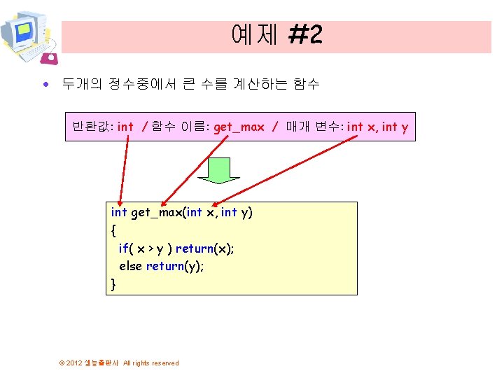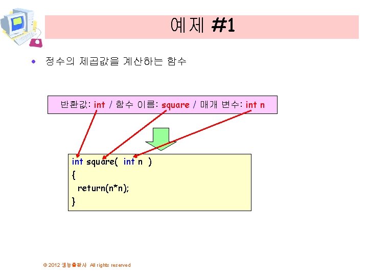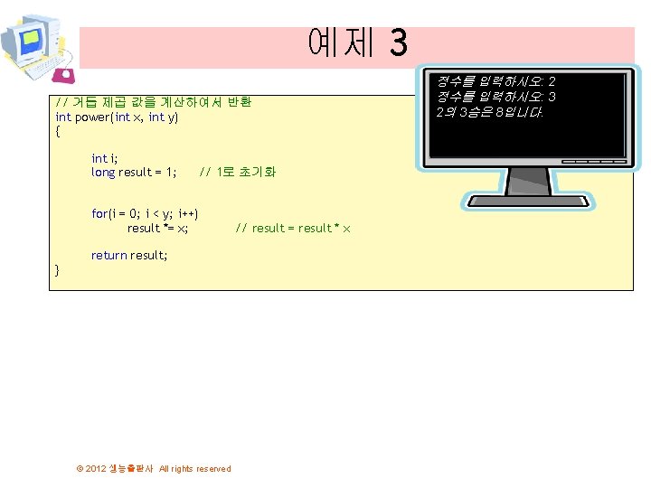 예제 3 // 거듭 제곱 값을 구하는 예제 #include <stdio. h> int get_integer(void); int power(int x, int y); int main(void) { int a, b; a = get_integer(); b = get_integer(); printf("%d의 %d승은 %d입니다. ", a, b, power(a, b)); return 0; } // 사용자로부터 값을 입력받아서 반환 int get_integer(void) { int n; printf("정수를 입력하시오: "); scanf("%d", &n); return n; } © 2012 생능출판사 All rights reserved