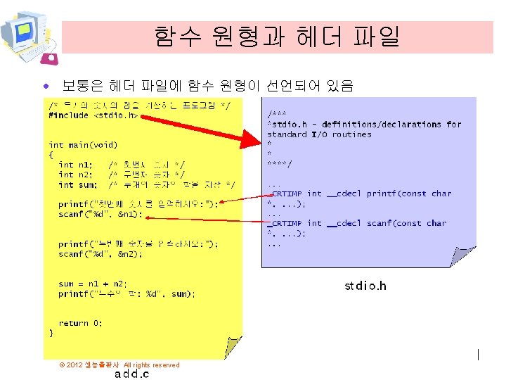 함수 원형 · 함수 원형(function prototyping): 컴파일러에게 함수에 대하여 미리 알리는 것 int compute_sum(int n); int main(void) { int sum; sum = compute_sum(100); printf(“sum=%d n”, sum); } int compute_sum(int n) { int i; int result = 0; for(i = 1; i <= n; i++) result += i; return result; } © 2012 생능출판사 All rights reserved compute_sum()은 함수 이름이랬지… 컴파일러