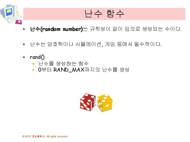 실습 코드 #include <stdio. h> #include <stdlib. h> int main(void) { int i; for(i = 0; i < 6; i++) printf("%d ", rand()); return 0; } 0에서 32767 사이의 정수로 생 성 © 2012 생능출판사 All rights reserved 41 18467 6334 26500 19169 15724