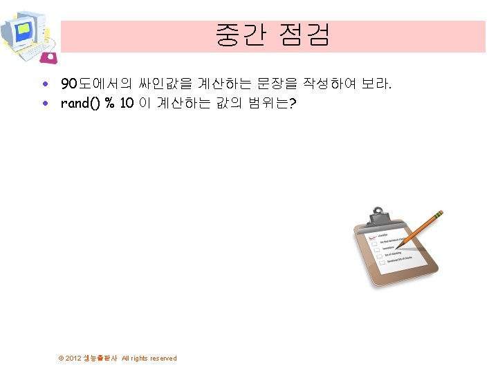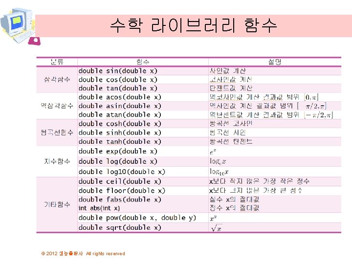 예제 // 삼각 함수 라이브러리 #include <math. h> #include <stdio. h> 여러 수학 함수들을 포함하는 표준 라이 브러리 int main( void ) { double pi = 3. 1415926535; double x, y; x = pi / 2; y = sin( x ); printf( "sin( %f ) = %fn", x, y ); y = sinh( x ); printf( "sinh( %f ) = %fn", x, y ); y = cos( x ); printf( "cos( %f ) = %fn", x, y ); y = cosh( x ); printf( "cosh( %f ) = %fn", x, y ); } © 2012 생능출판사 All rights reserved sin( 1. 570796 ) = 1. 000000 sinh( 1. 570796 ) = 2. 301299 cos( 1. 570796 ) = 0. 000000 cosh( 1. 570796 ) = 2. 509178