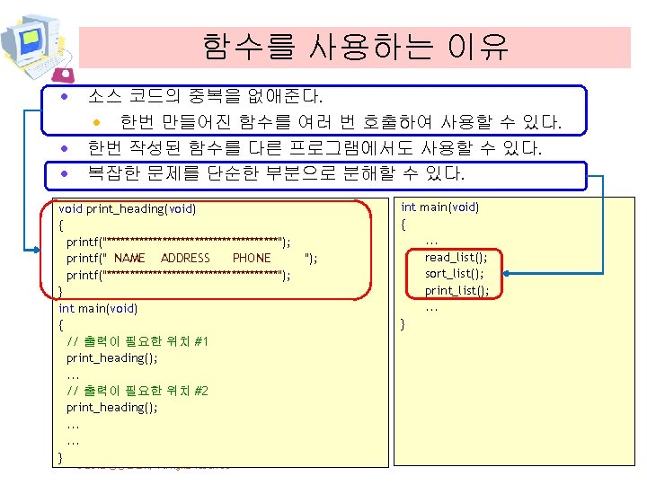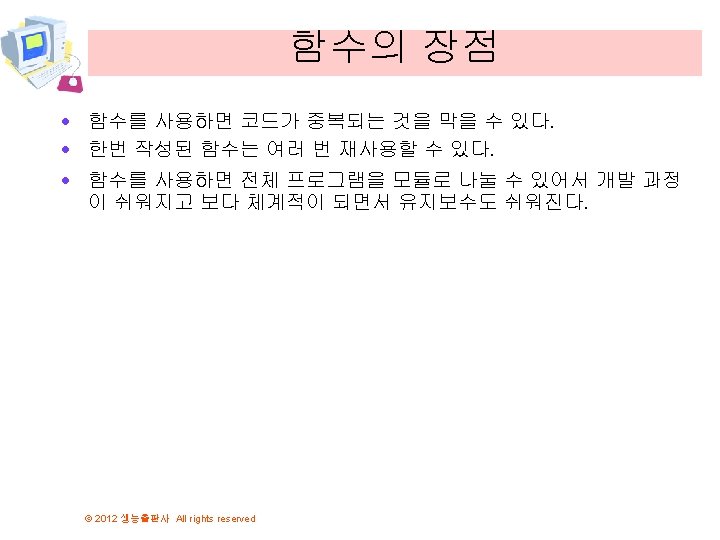 함수의 필요성 #include <stdio. h> void print_star() { int i; for(i = 0; i < 10; i++) printf("*"); } int main(void) { print_star(); . . . print_star(); return 0; } © 2012 생능출판사 All rights reserved 함수를 정의하였다. 함수는 한번 정 의되면 여러 번 호출하여서 실행이 가능하다.