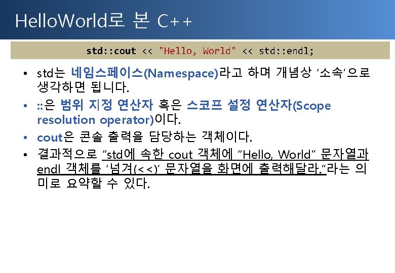 Hello. World로 본 C++ Hello. Cpp. cpp 직관적으로 << 연산자가 가리키는 방향이 모두 std: : cout으로 향하고 있다. // Hello. Cpp. cpp : 콘솔 응용 프로그램에 대한 진입점을 정의합니다. // #include "stdafx. h" #include <iostream> int _tmain(int argc, _TCHAR* argv[]) { std: : cout << "Hello, World" << std: : endl; return 0; }