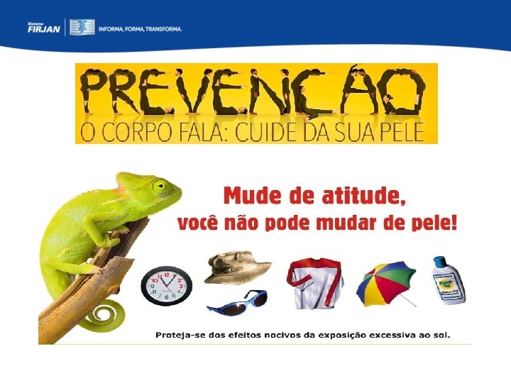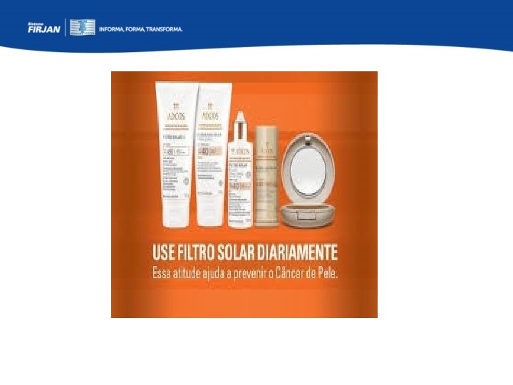 COMO PREVENIR? Evitar a exposição excessiva ao sol e proteger a pele dos efeitos da radiação UV são as melhores estratégias para prevenir o melanoma e outros tipos de tumores cutâneos. Os grupos de maior risco são os do fototipo I e II, ou seja: pele clara, sardas, cabelos claros ou ruivos e olhos claros. Além destes, os que possuem antecedentes familiares com histórico da doença, queimaduras solares, incapacidade para bronzear e pintas também devem ter atenção e cuidados redobrados. A Sociedade Brasileira de Dermatologia recomenda que as seguintes medidas de proteção sejam adotadas: § Usar chapéus, camisetas e protetores solares. § Evitar a exposição solar e permanecer na sombra entre 10 e 16 h (horário de verão). § Na praia ou na piscina, usar barracas feitas de algodão ou lona, que absorvem 50% da radiação ultravioleta. As barracas de nylon formam uma barreira pouco confiável: 95% dos raios UV ultrapassam o material. § Usar filtros solares diariamente, e não somente em horários de lazer ou diversão. Utilizar um produto que proteja contra radiação UVA e UVB e tenha um fator de proteção solar (FPS) 30, no mínimo. Reaplicar o produto a cada duas horas ou menos, nas atividades de lazer ao ar livre. Ao utilizar o produto no dia-adia, aplicar uma boa quantidade pela manhã e reaplicar antes de sair para o almoço. § Observar regularmente a própria pele, à procura de pintas ou manchas suspeitas. § Consultar um dermatologista uma vez ao ano, no mínimo, para um exame completo. § Manter bebês e crianças protegidos do sol. Filtros solares podem ser usados a partir dos seis meses.