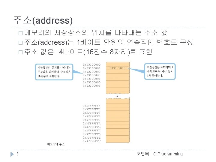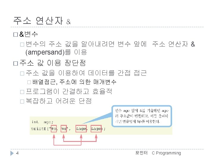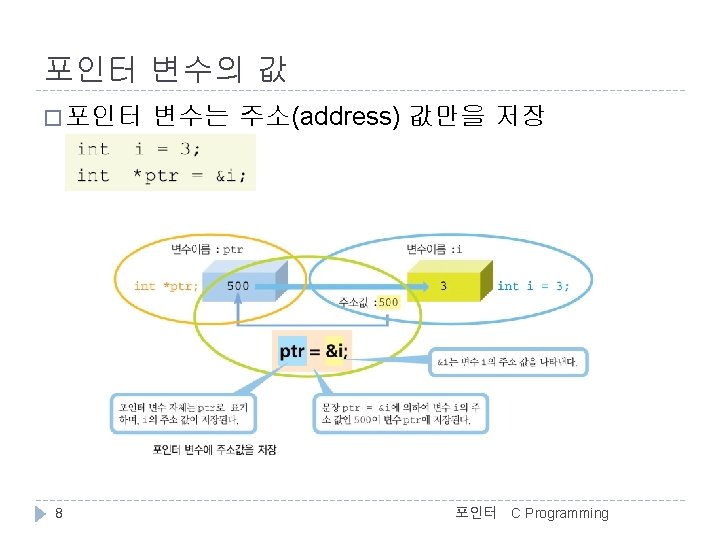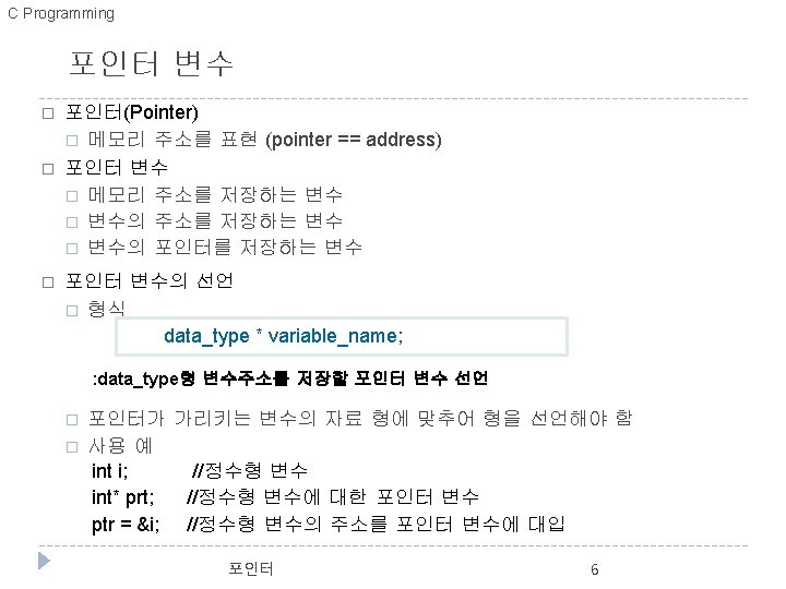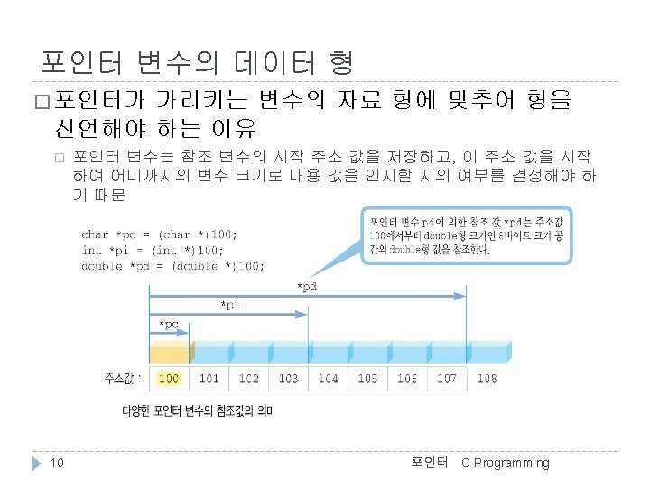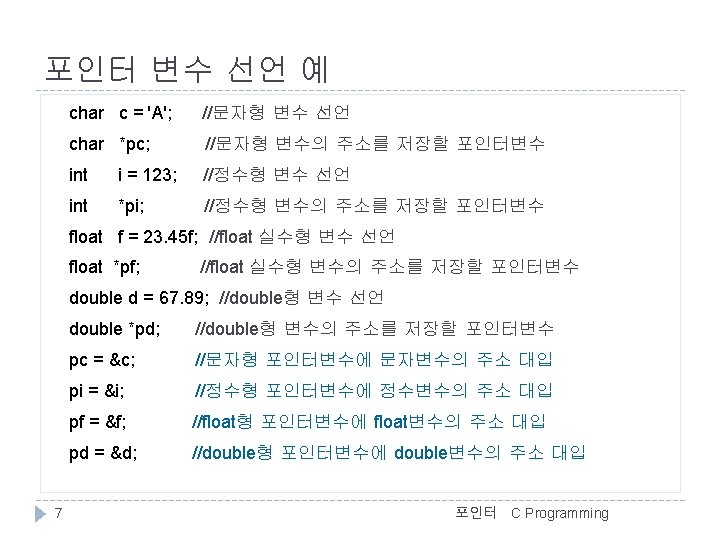 C Programming 변수의 주소 예 //변수와 주소(address. c) #include <stdio. h> int main() { char c = 'A'; int i = 123; float f = 4. 56 f; double d = 78. 9; >>변수의 값과 주소 c = A, &c = 0012 FF 7 C i = 123, &i = 0012 FF 78 f = 4. 56, &f = 0012 FF 74 d = 78. 90, &d = 0012 FF 6 C d 12 FF 6 C 78. 90 printf(">>변수의 값과 주소n"); printf("c = %c, &c = %pn", c, &c); printf("i = %d, &i = %pn", i, &i); printf("f = %. 2 f, &f = %pn", f, &f); printf("d = %. 2 f, &d = %pn", d, &d); f 12 FF 74 4. 56 i } 12 FF 78 123 c 포인터 12 FF 7 C ‘A’ 5