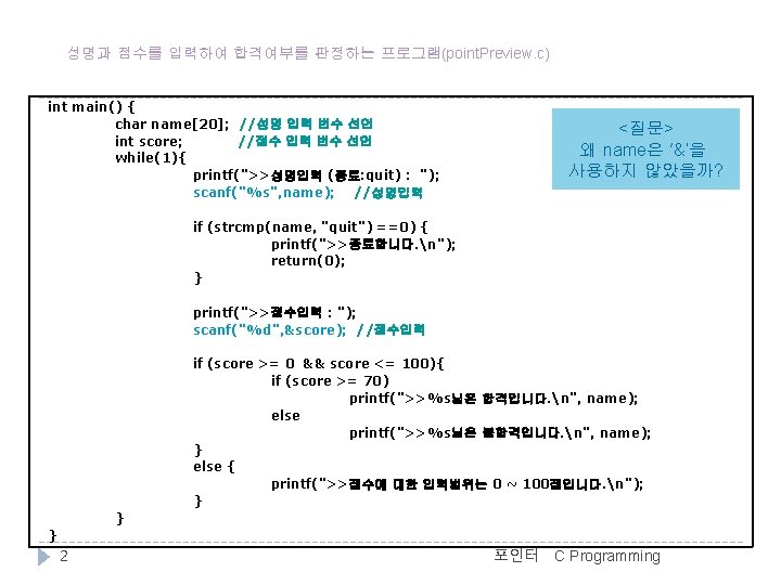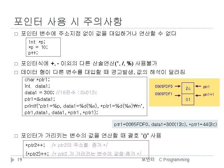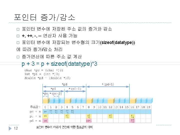 포인터 변수 사용 예 //포인터와 변수형(pointer. c) #include <stdio. h> int main() { char c = 'A'; char *pc; int i = 123; int *pi; float f = 4. 56; float *pf; double d = 78. 9; double *pd; //변수 c의 주소를 pc포인터 변수에 대입 //같은 데이터 형의 포인터변수를 이용하여 변수의 주소 대입 pc = &c; pi = &i; pf = &f; pd = &d; printf(">>변수의 주소n"); printf("&c = %p, &pc = %pn", &c, &pc); printf("&i = %p, &pi = %pn", &i, &pi); printf("&f = %p, &pf = %pn", &f, &pf); printf("&d = %p, &pd = %pn", &d, &pd); printf(">>변수의 값n"); printf("c = %5 c, pc = %X, *pc = %5 cn", c, pc, *pc); printf("i = %5 d, pi = %X, *pi = %5 dn", i, pi, *pi); printf("f = %5. 2 f, pf = %X, *pf = %5. 2 fn", f, pf, *pf); printf("d = %5. 2 f, pd = %X, *pd = %5. 2 fn", d, pd, *pd); 11 printf(">>변수의 크기n"); printf("sizeof(c) = %dn", sizeof(c)); printf("sizeof(i) = %dn", sizeof(i)); printf("sizeof(f) = %dn", sizeof(f)); printf("sizeof(d) = %dn", sizeof(d)); printf("sizeof(pc) = %dn", sizeof(pc)); return 0; } <출력결과> >>변수의 주소 &c = 12 FF 7 C, &pc = 12 FF 78 &i = 12 FF 74, &pi = 12 FF 70 &f = 12 FF 6 C, &pf = 12 FF 68 &d = 12 FF 60, &pd = 12 FF 5 C >>변수의 값 c= A, pc = 12 FF 7 C, *pc = A i = 123, pi = 12 FF 74, *pi = 123 f = 4. 56, pf = 12 FF 6 C, *pf = 4. 56 d = 78. 90, pd = 12 FF 60, *pd = 78. 90 >>변수의 크기 sizeof(c) = 1 sizeof(i) = 4 sizeof(f) = 4 sizeof(d) = 8 sizeof(pc) = 4 포인터 C Programming