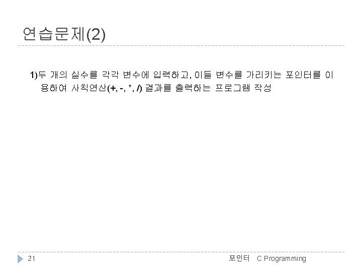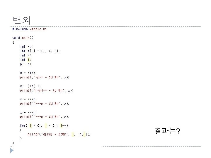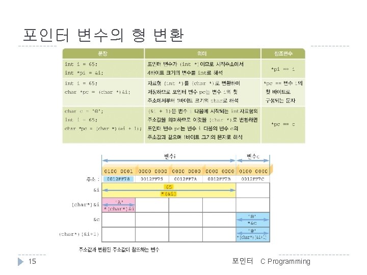 포인터 연산 예 //포인터 연산 #include <stdio. h> int main() { int i 1 = 123, i 2 = 456; int *pi; <출력결과> &i 1 = 0012 FF 7 C, i 1 = 123 &i 2 = 0012 FF 78, i 2 = 456 Before : pi = 0012 FF 7 C, *pi = 123 pi-- : pi = 0012 FF 78, *pi = 456 pi++ : pi = 0012 FF 7 C, *pi = 123 pi = &i 1; printf("&i 1 = %p, i 1 = %5 dn", &i 1, i 1); printf("&i 2 = %p, i 2 = %5 dn", &i 2, i 2); printf("Before : pi = %p, *pi = %5 dn", pi, *pi); pi--; // == (pi = pi - 1); printf("pi-- : pi = %p, *pi = %5 dn", pi, *pi); pi++; // == (pi = pi + 1); printf("pi++ : pi = %p, *pi = %5 dn", pi, *pi); return 0; } 14 포인터 C Programming