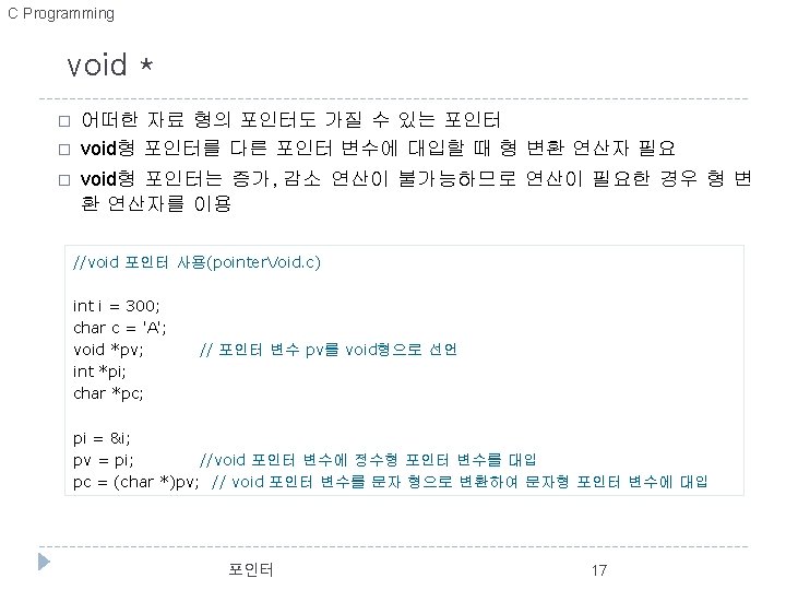 포인터 변수 형 변환 예 //포인터 형 변환 (pointer. Cast. c) #include <stdio. h> int main(){ int i = 65; int *pi; char *pc; pi = &i; printf("pi = &i => pi = %p, *pi = %5 dn", pi, *pi); pc = (char *)pi; printf("pc = (char *)pi => pc = %p, *pc = %5 dn", pc, *pc); *pc = 'B'; printf("*pc = 'B' => pi = %p, *pi = %5 dn", pi, *pi); printf(" => pc = %p, *pc = %5 dn", pc, *pc); pi = &i => pi = 0012 FF 7 C, *pi = 65 pc++; pc = (char *)pi => pc = 0012 FF 7 C, *pc = 65 printf("pc++ => pi = %p, *pi = %5 dn", pi, *pi); *pc = 'B' => pi = 0012 FF 7 C, *pi = 66 printf(" => pc = %p, *pc = %5 dn", pc, *pc); => pc = 0012 FF 7 C, *pc = 66 i = 256; pc++ => pi = 0012 FF 7 C, *pi = 66 printf("i = 256 => pi = %p, *pi = %5 dn", pi, *pi); => pc = 0012 FF 7 D, *pc = 0 printf(" => pc = %p, *pc = %5 dn", pc, *pc); i = 256 => pi = 0012 FF 7 C, *pi = 256 => pc = 0012 FF 7 D, *pc = 1 } 16 포인터 C Programming