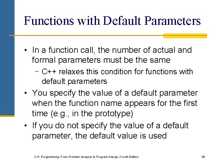 Functions with Default Parameters • In a function call, the number of actual and formal parameters must be the same − C++ relaxes this condition for functions with default parameters • You specify the value of a default parameter when the function name appears for the first time (e. g. , in the prototype) • If you do not specify the value of a default parameter, the default value is used C++ Programming: From Problem Analysis to Program Design, Fourth Edition 38