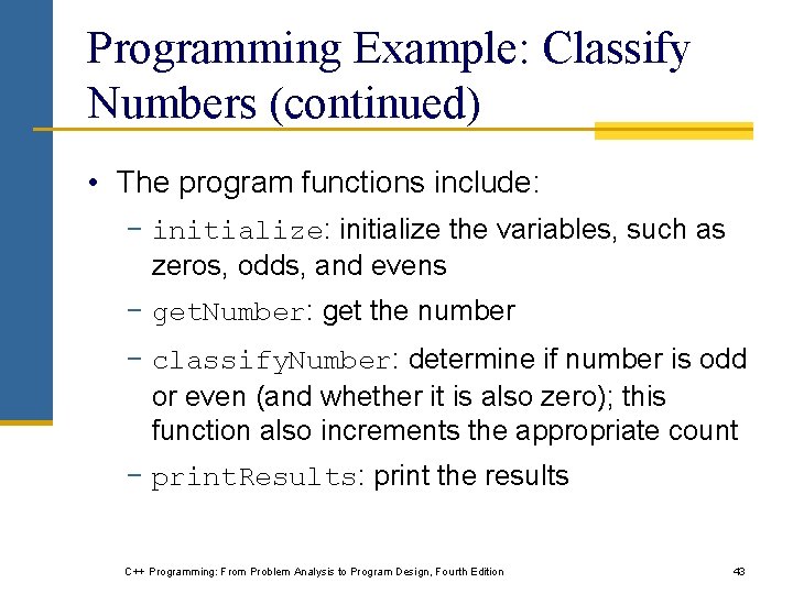 Programming Example: Classify Numbers • In this example, we use functions to rewrite the program that determines the number of odds and evens from a given list of integers • Main algorithm remains the same: − Initialize variables, zeros, odds, evens to 0 − Read a number − If number is even, increment the even count • If number is also zero, increment the zero count; else increment the odd count − Repeat Steps 2 -3 for each number in the list C++ Programming: From Problem Analysis to Program Design, Fourth Edition 42