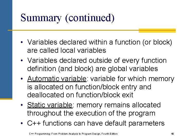 Summary (continued) • A value parameter receives a copy of its corresponding actual parameter • A reference parameter receives the memory address of its corresponding actual parameter − If a formal parameter needs to change the value of an actual parameter, you must declare this formal parameter as a reference parameter in the function heading C++ Programming: From Problem Analysis to Program Design, Fourth Edition 48