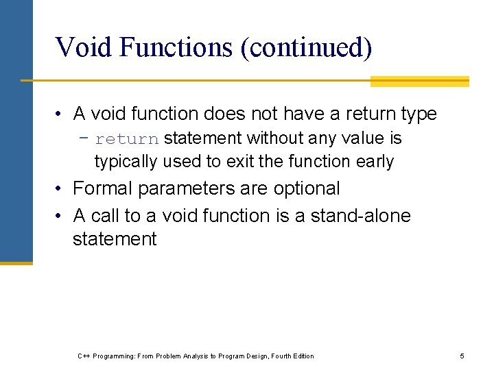 Void Functions • Void functions and value-returning functions have similar structures − Both have a heading part and a statement part • User-defined void functions can be placed either before or after the function main • If user-defined void functions are placed after the function main − The function prototype must be placed before the function main C++ Programming: From Problem Analysis to Program Design, Fourth Edition 4