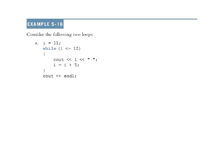 while Looping (Repetition) Structure (continued) • Infinite loop: continues to execute endlessly − Avoided by including statements in loop body that assure exit condition is eventually false C++ Programming: From Problem Analysis to Program Design, Fourth Edition 5