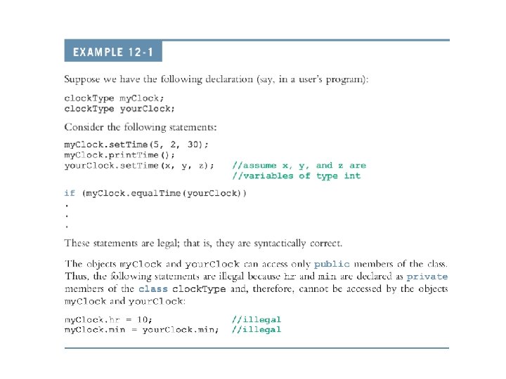 Variable (Object) Declaration • Once a class is defined, you can declare variables of that type clock. Type my. Clock; your. Clock; • A class variable is called a class object or class instance OOP stands for Object Oriented Programming: encapsulates data and functions into packages called classes. C++ Programming: From Problem Analysis to Program Design, Fourth Edition 9