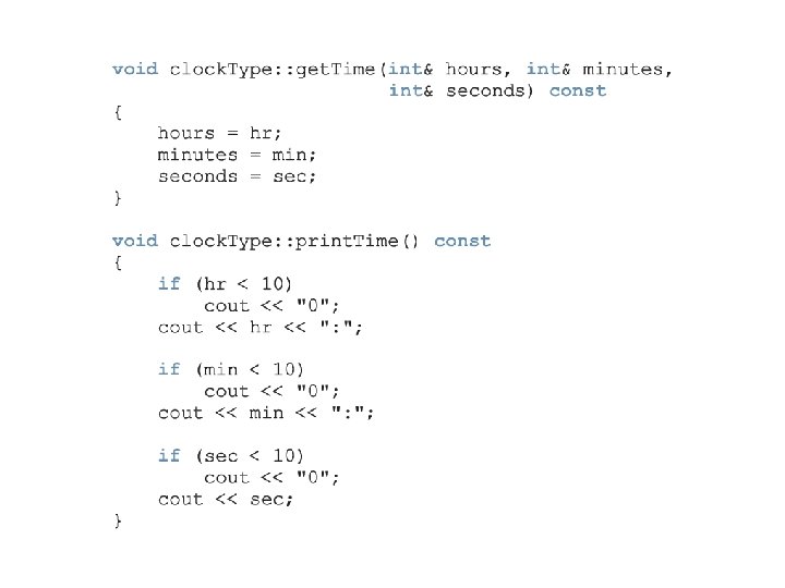 Implementation of Member Functions (continued) • Once a class is properly defined and implemented, it can be used in a program − A program that uses/manipulates the objects of a class is called a client of that class • When you declare objects of the class clock. Type, every object has its own copy of the member variables (hr, min, and sec) • Variables such as hr, min, and sec are called instance variables of the class − Every object has its own instance of the data C++ Programming: From Problem Analysis to Program Design, Fourth Edition 25