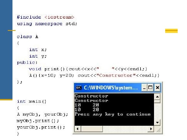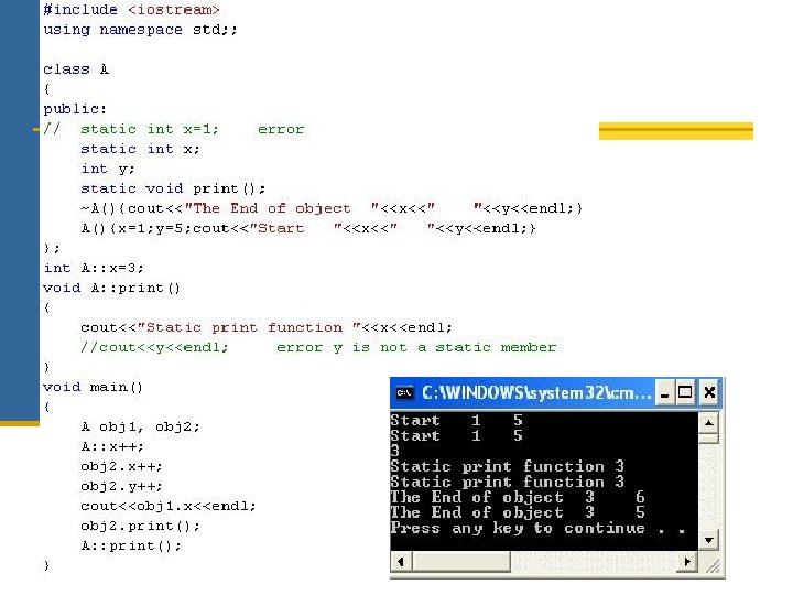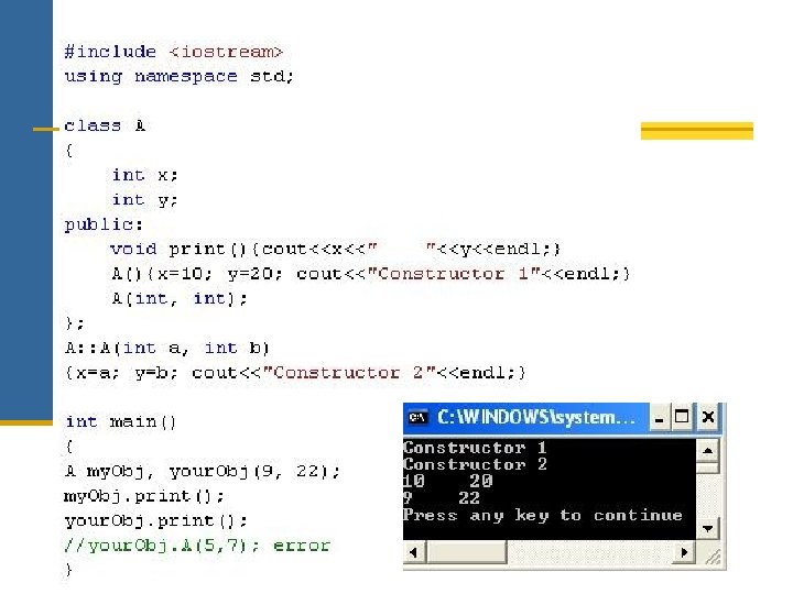 Examples class A { private: int x; public: Int y; A (int =0); A (int); public: }; A(); }; A (int); }; void main() { A obj 1(); //Not Correct? ! void main() { A obj 1; //illegal } A(int, int=0); void main() { }; A obj 1; //illegal } void main() { A obj 1; //Correct A obj 1(3); //illegal } }