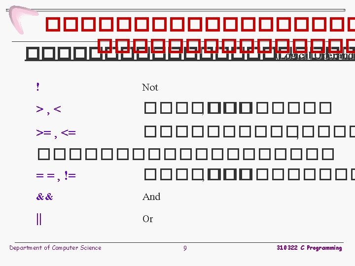 ��������������������� if <value 1 operand value 2> statement 1; else if <value 3 operand value 4 logical operand value 5 operand value 6> statement 2; else statement 3; value = ���������� operand = ����������� logical operand = 8 Department of Computer Science 310322 C Programming