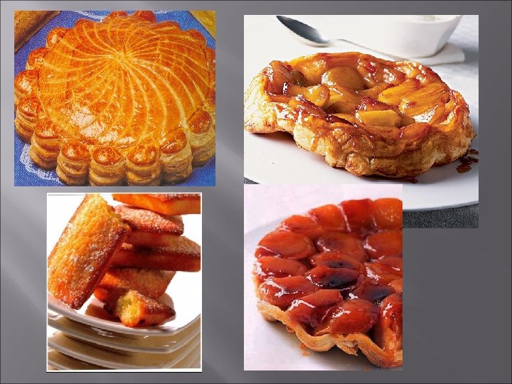 Traditional Dishes of Centre – Loire Valley – Desserts & Pastries Nougat de Tours – Nougat tart from Tours A baked tart filled with a fluffy batter of eggwhites, candied fruits, almond poweder and icing sugar. Tarte Tatin – Upside-down apple pie Apples are caramelized, then arranged in a decorative matter in a baking mild. Topped with pie dough and baked with the dough on top of the apples. Contrasting stories in terms of the origin of the Tart Tatin trace back to 1898 and Stephanie Tatin, at the Hotel Tatin in Lamotte-Beuvrong in the Sologne region of the Centre. Phitiviers A enclosed, round pie made with puff pastry generally filled with frangipan and fruits such as apples, cherries or plums. Financier de Sully – Financier from Sully A light, fluffy almond sponge (tea cake) usually baked I small rectangular molds. The name "financier" derives from the traditional rectangular mold, which resembles a bar of gold. The basis of the cake itself is beurre noisette (brown butter), egg whites, flour, almond powder and powdered sugar.