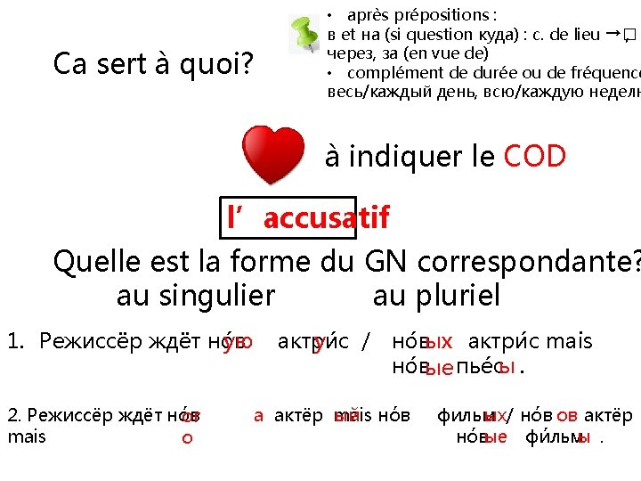 Ca sert à quoi? à indiquer le sujet ou l’attribut du sujet le nominatif Quelle est la forme du GN correspondante? au singulier au pluriel 1. Э то но вая актри са / но вы актри сы. 2. Э то но вы актёр / но ые в е актёры. й