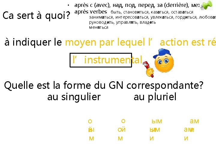 Ca sert à quoi? à former des compléments après les prépositions в, на, о(б) le prépositionnel Quelle est la forme du GN correspondante? au singulier ой о м au pluriel е е ы ы х х ах ах