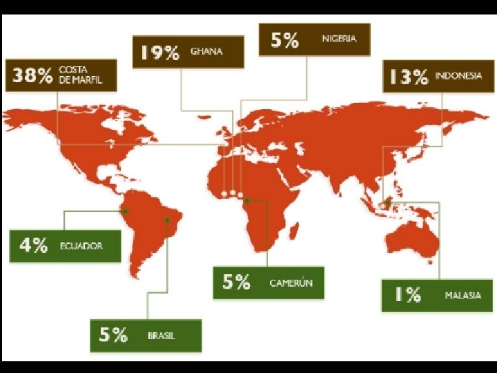 Actualmente, la mayor parte del cacao se sigue cultivando en África, y los mayores países productores son Costa de Marfil, Ghana, Indonesia, Nigeria, Camerún, Brasil, Ecuador y Malasia. El cacao se consume principalmente en Europa y Norteamérica, siendo los Países Bajos, Estados Unidos y Alemania los grandes consumidores del producto.
