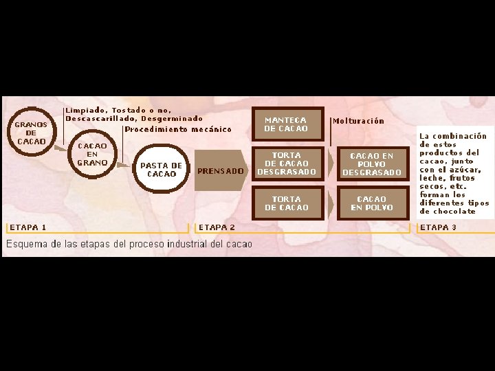 Presenta dos variedades básicas: criollo y forastero El CRIOLLO: exquisito para elaborar chocolate negro, es el mejor y el más caro. Procede de Ecuador y Venezuela El FORASTERO: o de consumo, más del 90% del cacao que se elabora. África Occidental y Brasil.