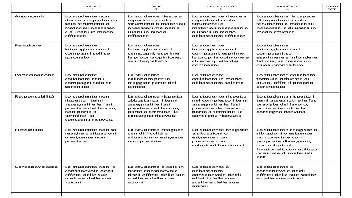 RUBRIC PER LA VALUTAZIONE DEL PROCESSO IN DI CA T O RI Autonomia Relazione Partecipazione responsabilità Flessibilità Consapevolezz a St in ba int av in ba int av ud en te 1 2 3 4 . . .