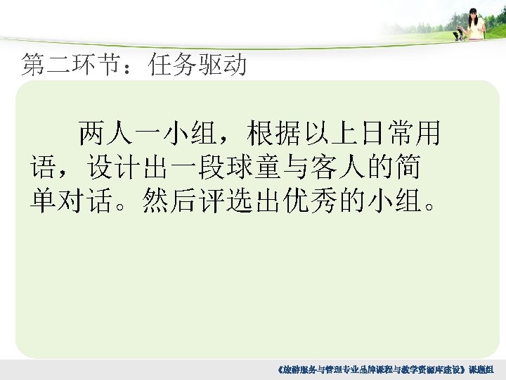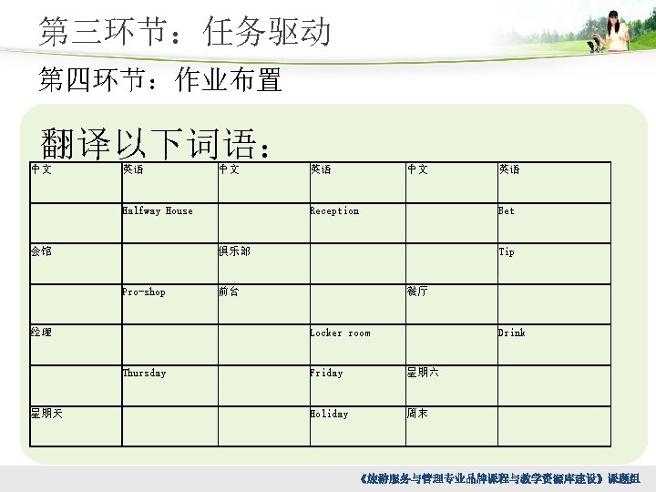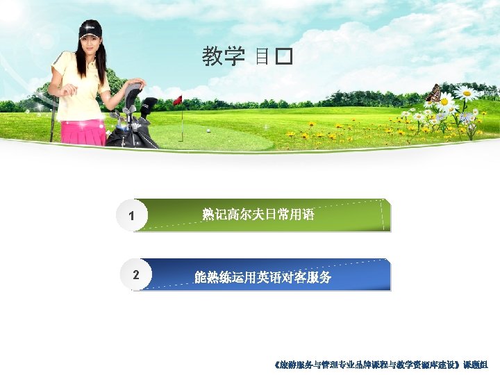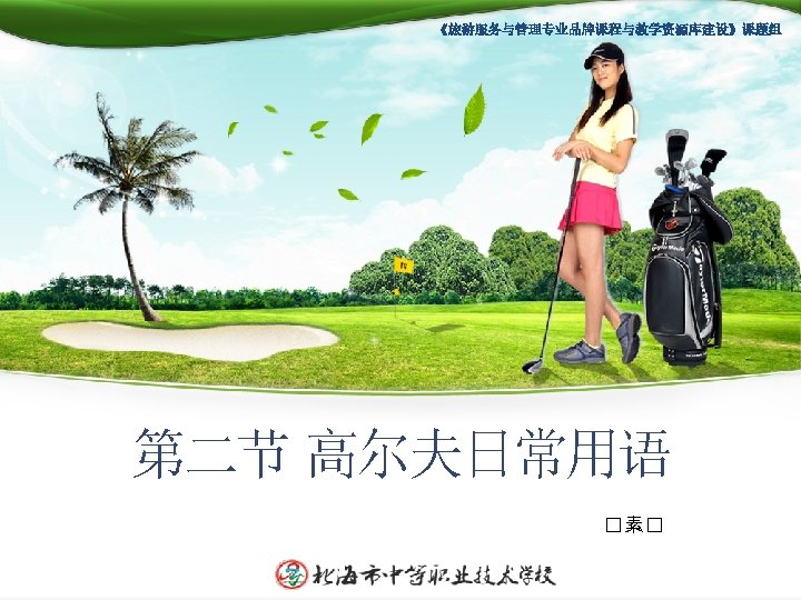 第一�� :� 授新� 一、会所常用英语 中文 球童 英语 caddie 球童 Caddie master 中文 球童长 英语 caddie master 中文 职业球员 英语 Professional 果岭费 Green fee 球童费 Caddie fee 洗手间 Toilet 赌 Bet 小费 Tip 领队 签名 Sigh 球童室 Caddie’s 凉亭 Halfway House 接待处 Reception 会馆 Club house 俱乐部 Club Room 专卖店 Pro-shop 前台 Front counter 餐厅 Restaurant 经理 高尔夫球员 消费卡 Manager Golfer Expense Card / Score Card 更衣室 好运 早上好 Locker room Good luck Good Morning 喝 休息一下 下午好 Drink Have a rest Good Afternoon 晚上好 Good Evening 再会 Good-Bye / Bye 过一会见 See You Later 下一次见 See You Next Time 《旅游服务与管理专业品牌课程与教学资源库建设》课题组