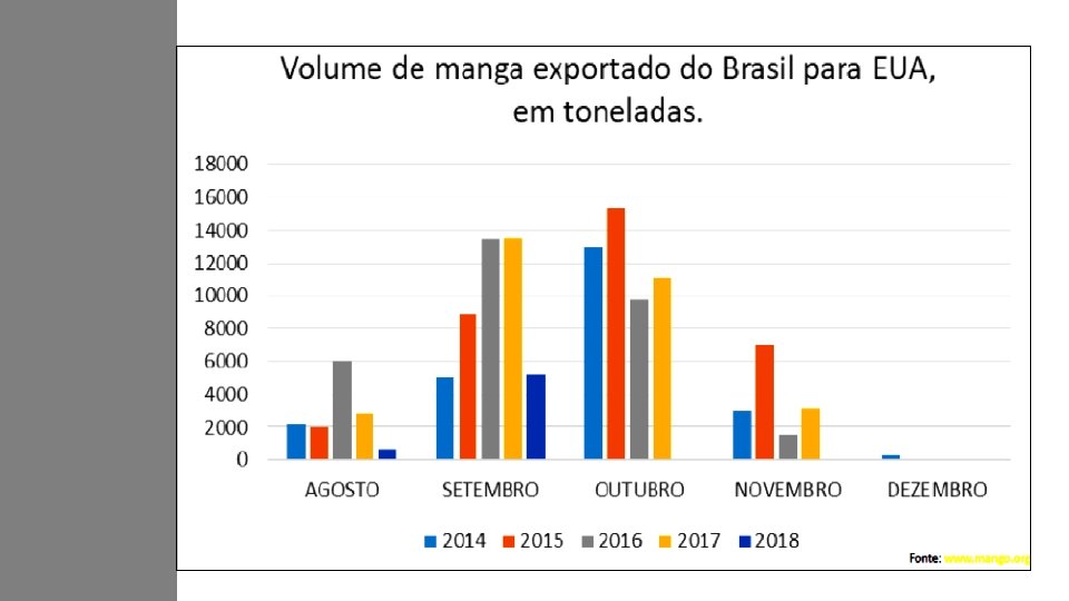 CADEIA PRODUTIVA DE MANGA • Temporada brasileira: Início: agosto Finaliza: primeira semana de dezembro Projeção: aproximadamente 8 milhões de caixas. Volume na semana que termina em 03/11/18 • O volume embarcado do Brasil foi de aproximadamente 269. 726 caixas para um total de 7. 518. 962 caixas para a temporada. • Na mesma semana do ano passado, o volume embarcado do Brasil foi de aproximadamente 105. 448 caixas para um total de 7. 738. 275 caixas. FONTE: Mango Crop Report Updated November 9, 2018 - Page 13