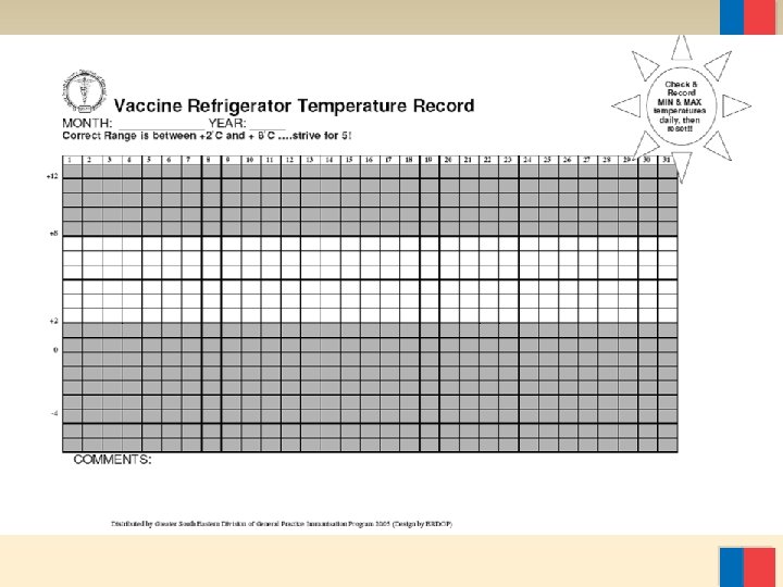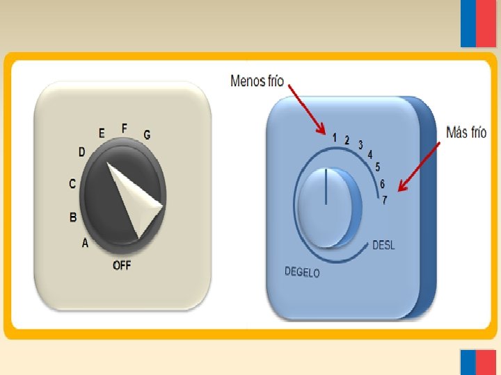Termómetros de dial v Requiere recalibración. v Algunos incluyen indicación de temperaturas máx. /mín. v Para ser utilizado en las centrales de vacunas. v Se colocan 2 sensores: Uno en el lugar más frío y otro en el lugar más cálido