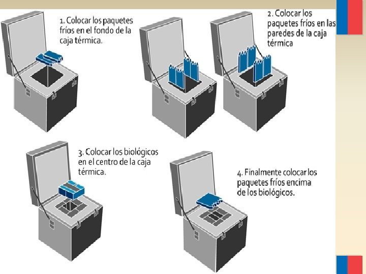 Procedimiento para utilizar las cajas frías v Cartón delgado separando vacunas de unidades refrigerantes, vacunas en sus cajas. v Vacunas víricas abajo y bacterianas arriba. v Traslado de vacunas con cajas cerradas, a la sombra y alejadas de fuente de calor.