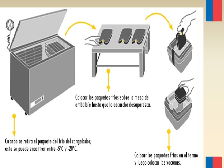 Procedimiento para utilizar las cajas frías v Caja limpia y seca. v Unidades refrigerantes desde el refrigerador al chorro de agua, para eliminar la escarcha externa, secarlas y disponerlas rodeando las paredes internas. v Colocar el termómetro y cerrar la caja. v Leer el termómetro a los 15 a 20 minutos (2ºC a 8ºC). v Cargar las vacunas.