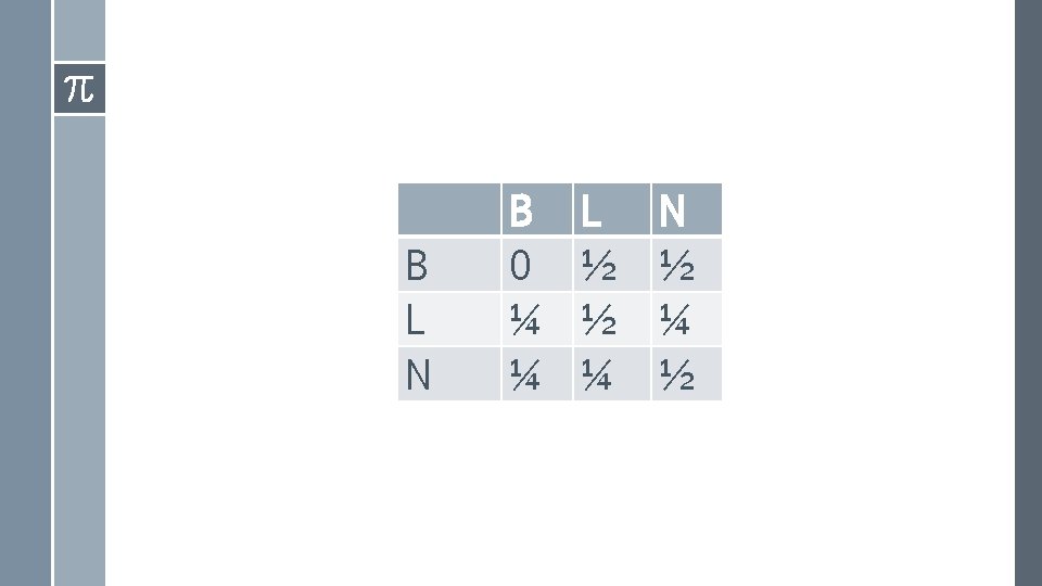 Como quedarían las probabilidades ? › De un buen día a un buen día BB = 0 › De un buen día a un día lluvioso BL = ½ › De un buen día a un día con nieve BN = ½ › De un día lluvioso a un día lluvioso LL = ½ › De un día lluvioso a un buen LB= ¼ › De un día lluvioso a un día con nieve ¼ LN = › De un día con nieve a un día con nieve ¼ NN = › De un día con nieve a un día con lluvia ¼ NL = › De un día con nieve a un buen día ½ NB =