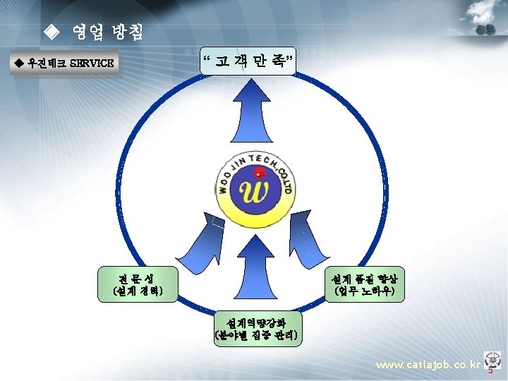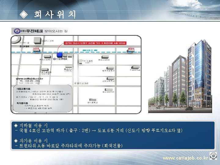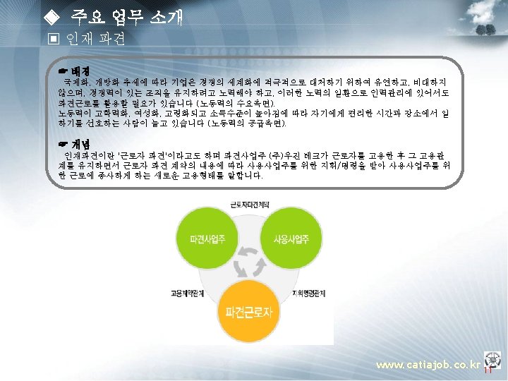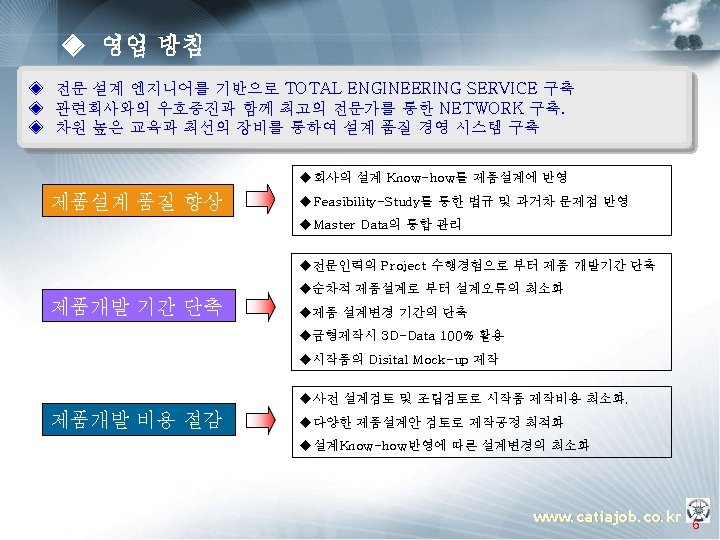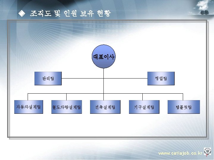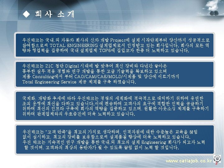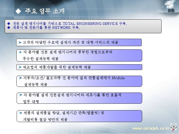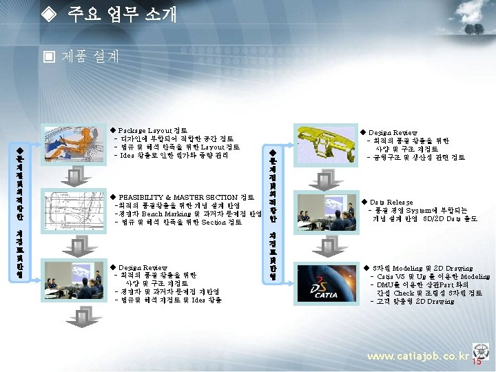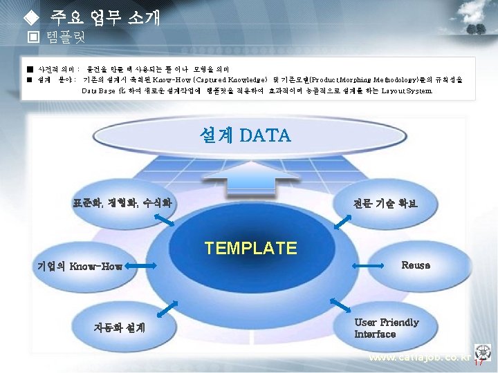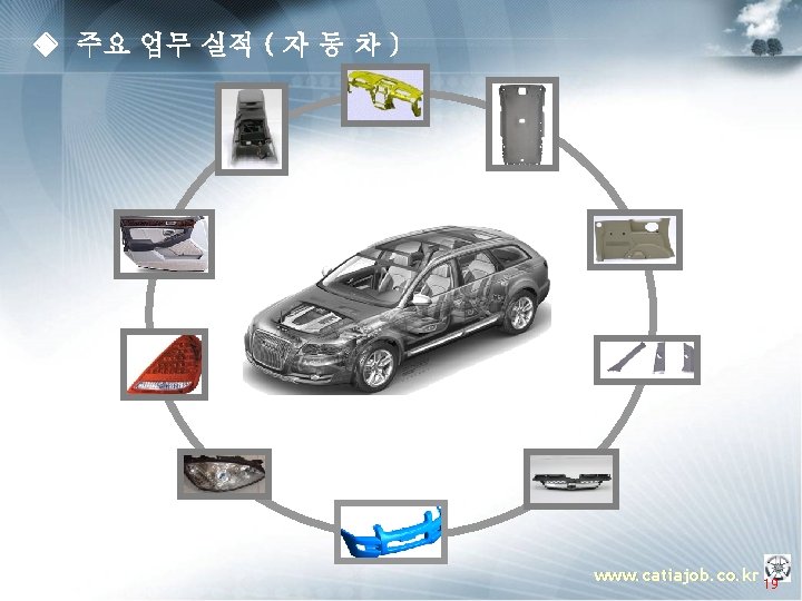 ◈ 주요 업무 소개 ▣ 템플릿 OEM (Manager) § 프로젝트 운영지원 § 프로젝트 Advisor § 컨설팅 방법론 총괄 지휘 PM (Project Manager) § 설계 프로세스 표준화 과제 도출 § Template 구축 방법론 전개 § Guide 모델링 방법론 정립 § 진척도 & Issue 관리 PE(Project Engineer) TA(Template Assitant) § 인원, 일정 관리 PA(Program Assistant) PE(Project Engineer) TA(Template Assitant) Assistant. PA(Program ) u OEM (Manager) : 업체 당담자로서 해당 프로젝트에 관한 전반적인 상황을 조율 하는 자. u PM (Project Manager) : Total Project의 담당자로서 OEM측과 업무 조율 및 PE에 업무지시 하는 자. u PE (Project Engineer) : Sub Project의 담당자로서 PM측과 업무조율 및 TA 와 PA 업무지시 하는 자. u TA (Template Assitant) : Template 개발 Enigneer u PA (Program Assitant) : Program 개발 Enigneer www. catiajob. co. kr 18