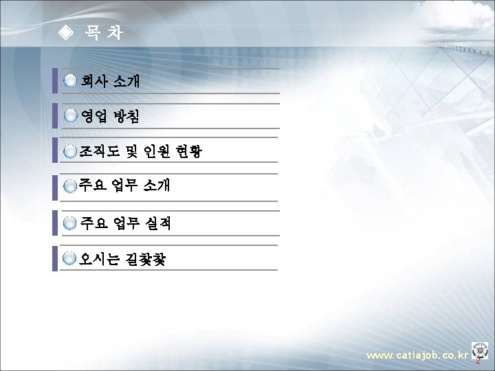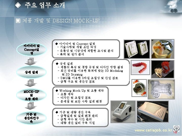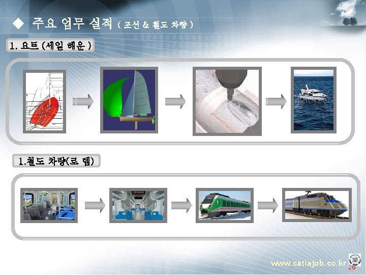 ▣ 내, 외장분야 Automotive - Door Trim, Seat for Hyundai & Kia Customer Project Item AM VG Door Trim ASSY XM Seat ASSY DAEWON L 43 Seat ASSY LG CHEM HM Seat ASSY Johnson Control Instrument Panel Headlining Floor Carpet Door Trim & Pillar Trim Seat ASSY Instrument Panel A/B/C Trim Console Pillar Radiator Grille Cowl Top Cover Gate Garnish. Tail Rear Garnish www. catiajob. co. kr 24