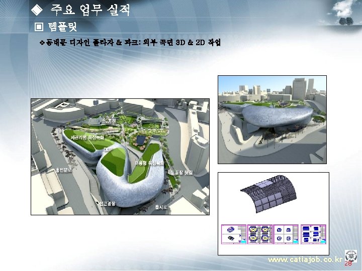 ◈ 주요 업무 실적 - ▣ 템플릿 v 범위(남측 면 48 X 18) - ANCHOR - T BAR - MOLDING - GLASS 신축 서울시청사조감도 Assy Product (Curtain Wall) PROJECT 적용범위 Skin www. catiajob. co. kr 29