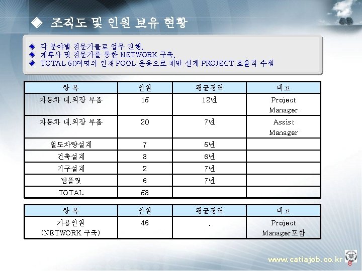 ▣ 내, 외장분야 Interior Trim Exterior Trim OEM Project Layout Detailing Refinemen t Hyundai Motors SL PO LM VG HM EP VQ KM ◎ ◎ ◎ ◎ ◎ ◎ OEM Project Layout Detailing Refinemen t Hyundai Motors SL TF ED FD SA AM ◎ ◎ ◎ ◎ ◎ www. catiajob. co. kr 21