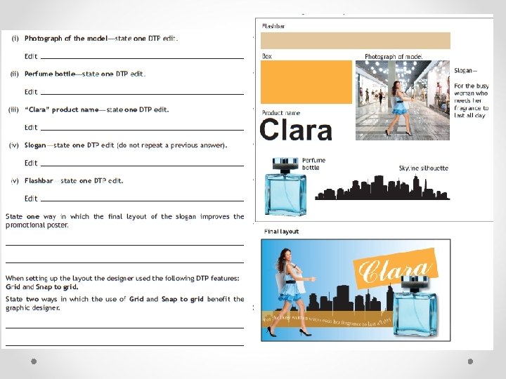 CAG/DTP Techniques The techniques are used to create visual excitement on a page. They can add to the over feel and mood that the designer is trying to portray. They also provide the designer with a method of using stock photos and editing them to suit the scene that they want. Drop Shadow Transparency Grid Rotate Guidelines and Columns Frame Reverse Text Wrap Fonts Crop Colour Fill Mirror Flow text along a path Bleed Import/Export