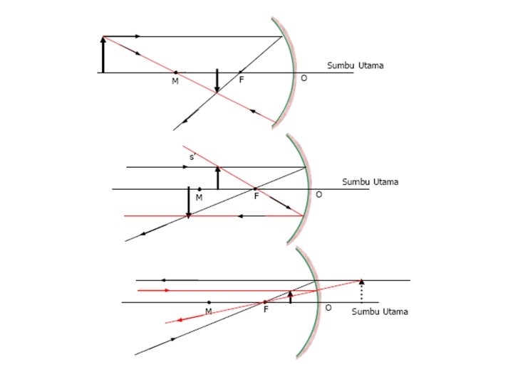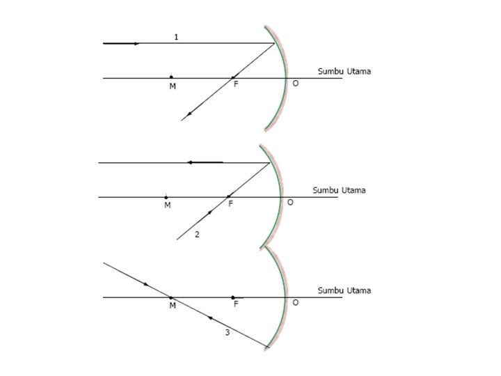 Sinar-sinar Istimewa pada cermin Cekung: • Sinar datang sejajar sumbu utama dipantulkan melalui titik fokus. • Sinar datang melalui titik fokus dipantulkan sejajar sumbu utama. • Sinar datang melalui pusat kelengkungan cermin dipantulkan melalui titik itu juga.