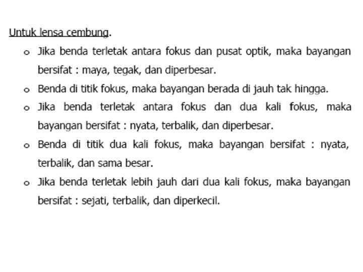 Sinar-sinar istimewa pada lensa cembung: • Sinar datang sejajar sumbu utama akan dibiaskan melalui titik fokus F 1. • Sinar datang melalui titik fokus pasif F 2 akan dibiaskan sejajar sumbu utama. • Sinar datang melalui titik pusat optik O akan diteruskan tanpa dibiaskan.