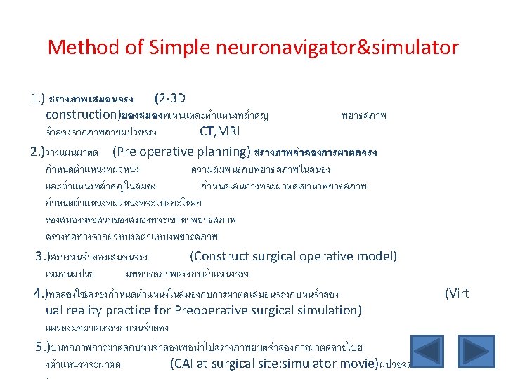 Objective • Understanding of Excellence surgery Virtual reality simulation of neurosurgical procedure: Brain abscess resection Simple neuronavigator Neurosurgical operative models Neurosurgical technic : Brain abscess resection • Neurosurgical skill training