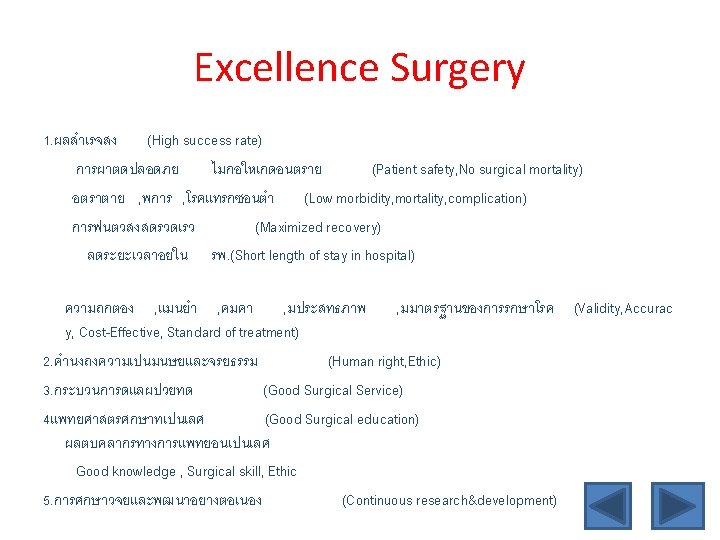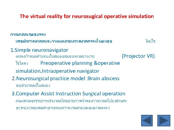 Successful Excellence surgical development project series 3 Aspects of development for Excellence Surgery ๑. ดานความร (Knowledge) E-learning Research series Genius formation Excellence Neurosurgical quality ๒. ดานจรยธรรม (Ethic) Empowering ethic in medical education(Good surgical practice, patient safety) Ethic E-larning &Research series ๓. ดานทกษะการผาตด (Surgical skill, technic) Virtual reality for neurosugical operative simulation Simple virtual reality neuronavigator Neurosurgical practice models Computer Assist Instruction (CAI) for surgical operation Neurosurgical equipment