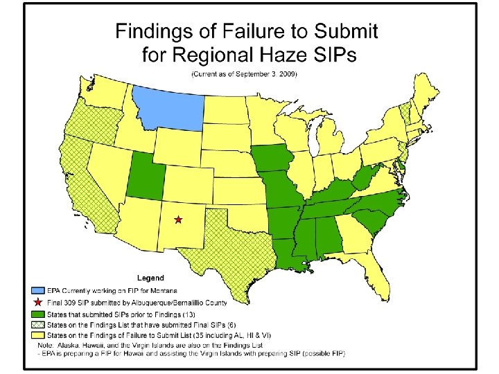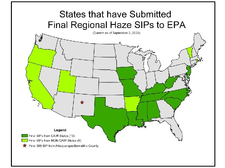 Reasons Remaining SIPs Not Yet Submitted • CAIR Court Rulings – CAIR States hesitant to finish SIPs without firm direction on what EPA would deem approvable. • Other Priorities (e. g. , PM, Ozone SIPs) – Due to resource constraints, States put health-based standards as higher priority. • State rulemakings for BART and/or Reasonable Progress (RP) Authority – Some states needed to establish authority for requiring BART/RP control & facility submissions. – Rulemakings took longer than expected. • Source Negotiations for BART & RP – Negotiations took longer than expected. – Certain cases very contentious and/or resulted in legal challenges. – Technical issues still unresolved in some states.