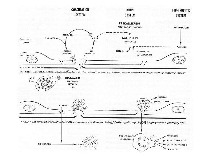 Interaction of Kinin-, Coagulation- and Complement system during acute inflammation Factor XII (Hageman) Collagen, basement membrane, platelets and microbial surfaces XIIa Kinin cascade Kallikrein Prekallikrein Prothrombin HMWK Plasminogen Bradykinin Clotting cascade sic n i r y Int hwa t pa Thrombin PAR* Acute Inflammation Fibrinolysis Plasmin Fibrinogen Complement C 3 a * Protease activated receptors