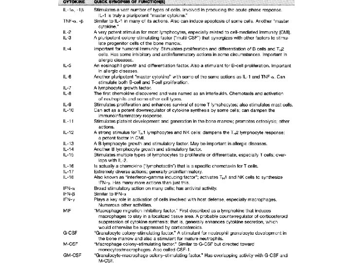 CYTOKINES • Transmitters for cell-to-cell chatting – Modulate cell function • Primarily from activated macrophages and lymphocytes • IL-1, IL-8, TNF