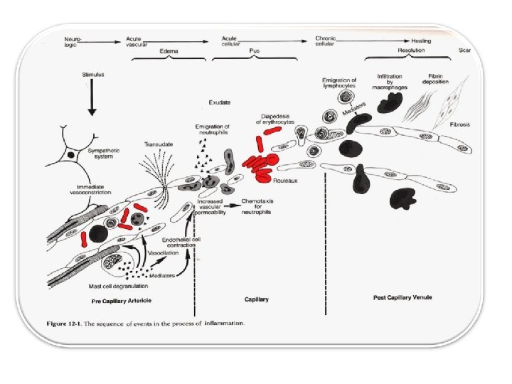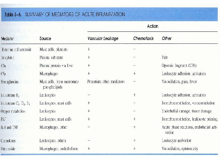 CHEMICAL MEDIATORS • Vasodilation – Prostaglandins, Nitric Oxide • Increased Vascular Permeability – Vasoactive amines (histamine, serotonin), C 3 a and C 5 a, Bradykinin, Leukotrienes, PAF, • Chemotaxic Leukocyte Activation – C 5 a, LTB 4, Chemokines