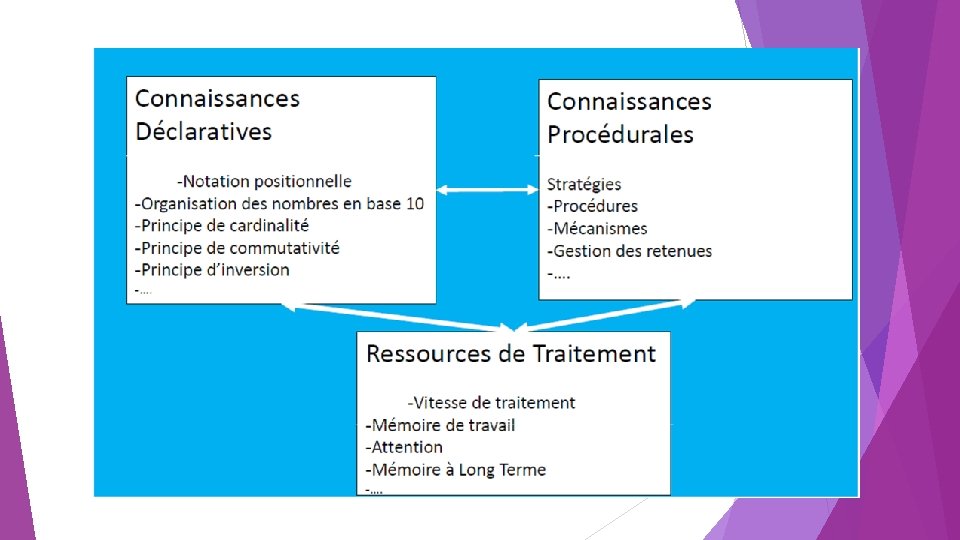 La mémoire à long terme : Mémoire déclarative / mémoire procédurale Mémoire déclarative : mémoire des connaissances déclaratives que l’on peut dire : les faits numériques mémorisés (Les tables, les doubles, les décompositions de 10…) Mémoire procédurale : mémoire des savoirs relatifs aux procédures, à la manière de traiter les informations ; il s’agit de savoirs faire. Les connaissances déclaratives nécessitent d’être vues une seule fois ou très peu pour être enregistrées en mémoire à long terme. En revanche, les savoirs faire nécessitent un temps d’apprentissage pour être enregistrés en mémoire procédurale. Cependant, l’oubli y est beaucoup plus rare.