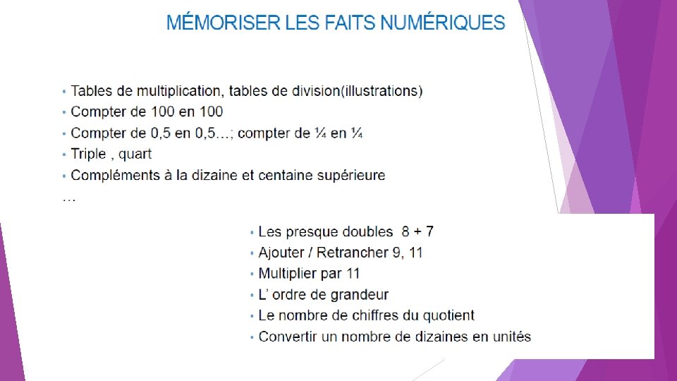 Conséquences… pour réussir un calcul mental Nécessité pour l’élève de s’appuyer sur des résultats connus (déjà mémorisés dans la mémoire à long terme) / « Les faits numériques » . Nécessité de choisir des procédures rapides, efficientes pour limiter en temps et en quantité le nombre d’informations dans la mémoire de travail. Pour cela, nécessité de s’appuyer sur des procédures efficientes mémorisés en mémoire à long terme.